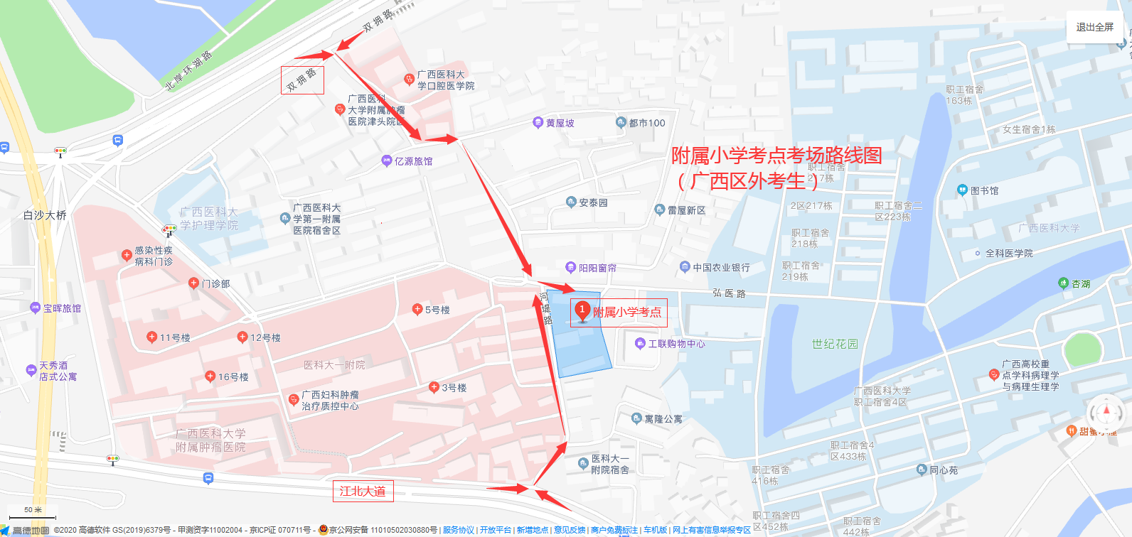 备注:无出入证者不能从双拥路22号校本部正大门穿过校园出后门到达附属小学考点,只能按照下图所示路线到达考点;因小路交通拥挤且无停车场地,不建议驾车从双拥路或江北大道前往考场!