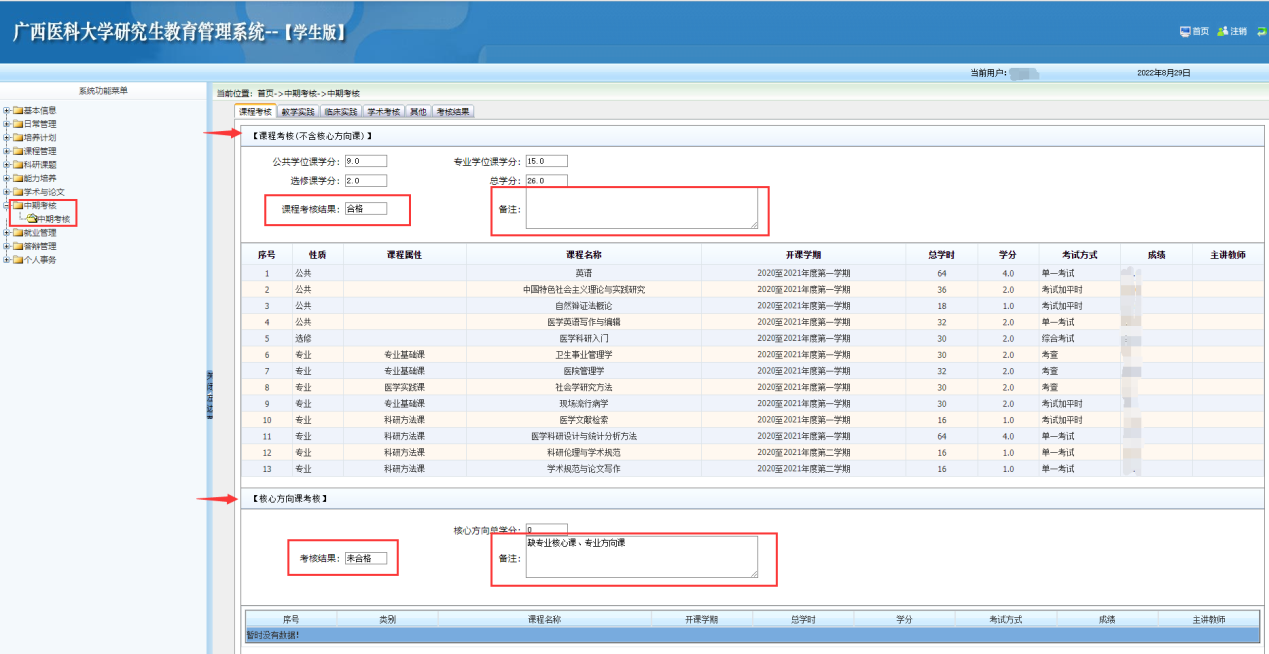 此模块结果显示为“合格”,即为核心方向课考核审核通过;显示为“未合格”,即为核心方向课考核审核不通过;“未合格”的原因详见“备注”栏的批注。2021级研究生的专业核心课、专业方向课由各相关培养单位(二级学院)组织各学科开课(一般安排在第五学期),成绩由各教研室录入。如对此模块考核结果有异议者,可向所在单位(学院)研究生教学管理部门复核。