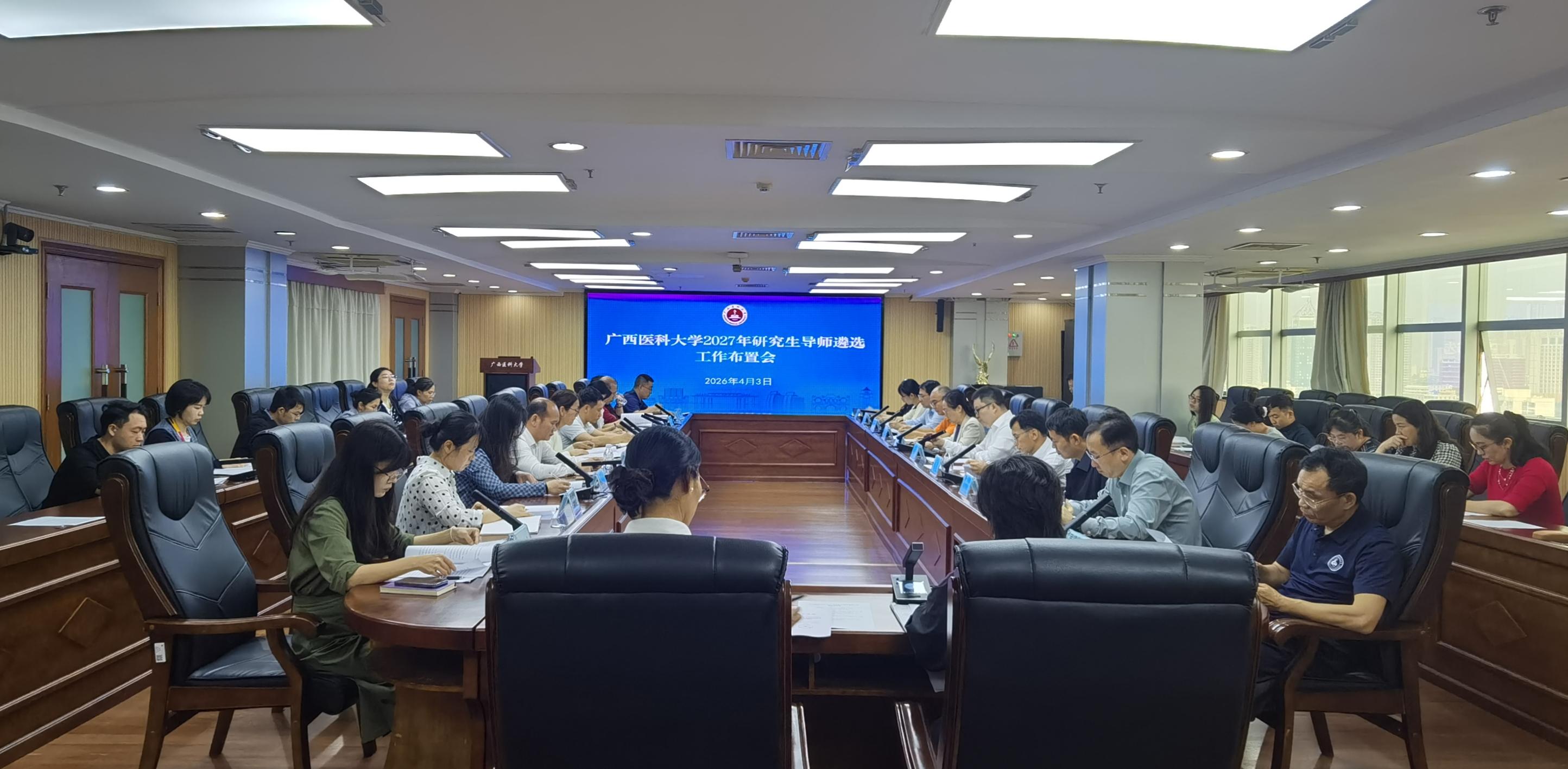 2026年4月3日上午,研究生院、研究生工作部在校本部综合楼14楼会议室召开2027年度研究生导师遴选工作布置会。研究生院、研究生工作部负责人,校内各研究生培养单位分管研究生教育工作的负责人及教研科科长参会。